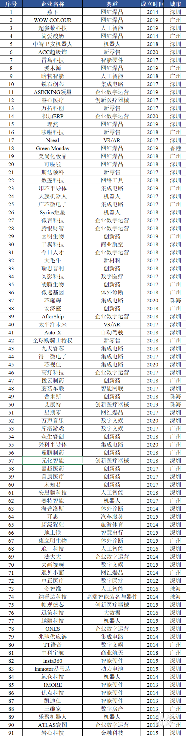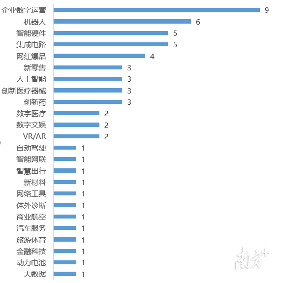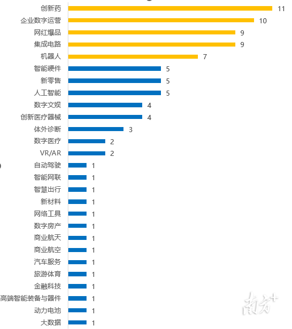 图4:广州潜在独角兽企业赛道分布 2021年,广州潜在独角兽企业共26家,其中新晋企业12家。广州潜在独角兽企业主要分布于创新药、网红爆品、集成电路、数字文娱、体外诊断、新零售等11个赛道。具体呈现三个特点。 首先,创新药领域潜在独角兽企业数量最多。广州创新药赛道拥有7家潜在独角兽企业,占全市总量的26.9%,其中6家企业位于广州高新区。近年来,广州高新区通过引培并举构建具有全球影响力的生物医药产业集群,整体实力逐步进入全球第一梯队,在生物制药、第三方医学检验检测、基因测序领域全国领先。其中,其中,众生睿创专注于呼吸系统和代谢性疾病领域创新药物研发,其口服抗新冠病毒创新药3CL蛋白酶抑制剂RAY1216进入Ⅲ期临床;微远基因专注于基因技术创新与感染精准医疗,其自主研发的病原宏基因组学检测(mNGS)技术,可以一次性完成超过18000种病原体的鉴定分析。 其次,新消费领域潜在独角兽企业蓬勃发展。广州“新粤商”以数字化技术赋能商贸零售,在美妆、餐饮等领域诞生了一批潜在独角兽。WOW COLOUR、遇见小面等潜在独角兽企业依托广州“千年商都”完善的产业链供应链体系,积极开展网红爆品新模式探索。 此外,集成电路领域潜在独角兽企业爆发成长。2021年,广州集成电路领域潜在独角兽企业实现突破,广州高新区3家集成电路领域潜在独角兽企业入榜,分别为印芯半导体、广芯微电子、兴科半导体。近年来,广州高新区不断加强集成电路产业布局,加快打造中国集成电路产业第三极核心承载区,在卫星导航芯片、电子元器件、FPGA芯片等关键核心技术领域实现“卡脖子”突破。 深圳数字化、智能化应用潜在独角兽企业领跑全国